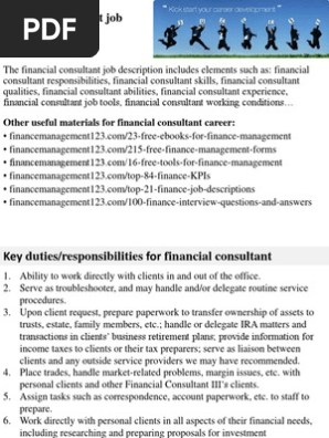 Assessing client's overall financial picture, understand their needs and develop a solid financial plan. Another skill is finance skills as the financial consultant will have to be able to help the organization create financial plans. Requirements for consultants virtually all consultants will earn a college degree prior to entering the field. A broad range of degrees will be acceptable, but common majors include engineering, business, mathematics, economics, information technology, and computer science. There are eligibility requirements to work with a dedicated financial consultant. While financial consultants have potentially greater incomes,. Financial consultant responsibilities include forecasting costs and revenues, conducting risk analyses for financial plans and evaluating capital expansion options (e.g. Financial advisor skills & competencies One of the most important skills that a financial consultant will have is great attention to detail. A master's degree is often required for more advanced positions. You must have a strong entrepreneurial spirit bolstered by confidence, persistence and a high degree of personal integrity. This will be done by first examining a client's financial situation, devising and presenting appropriate strategies, and keeping track of any shifts in his or her financial status and living situation. This certification requires a bachelor's degree, three years of work experience, successful completion of an exam, and adherence to a code of ethics.
